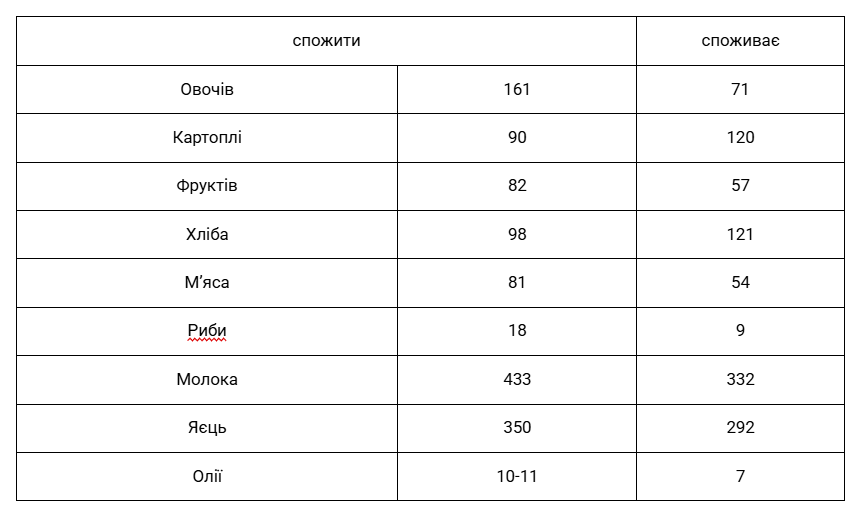 Звідси бачимо, що в нашому раціоні переважає картопля і хліб. За своєї недбалості, недоїдаємо овочі і фрукти, які маємо вдома. Чому нема щоденно на нашому столі моркви, капусти, горіхів, столового буряка, яблук, перцю, цибулі, часнику. Адже морква – це пам’ять, розум дітей. Вона покращує обмінні процес мозку. Сприяє підвищенню працездатності.